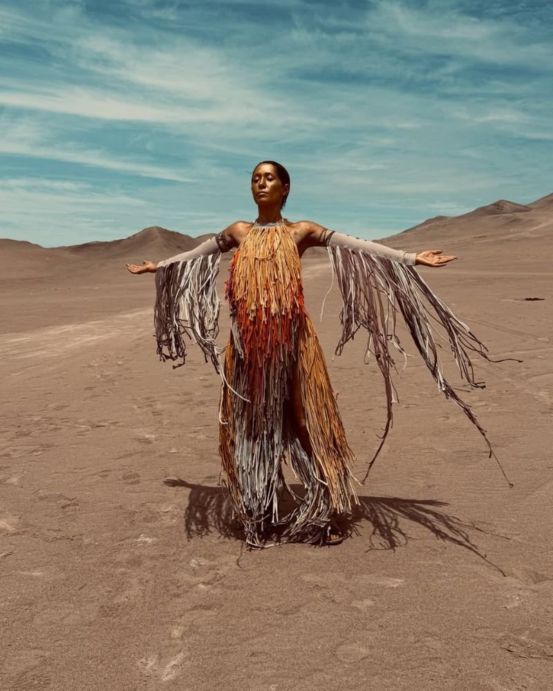 Uno de los momentos más hermosos fue la intervención de la diseñadora @fabiola.aillon. Con las mismas prendas del gigante creó un vestido cargado de movimiento y simbolismo.