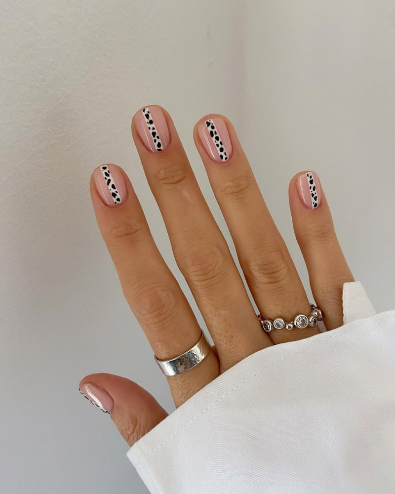 Para quienes prefieren algo discreto, una sola uña con efecto dálmata puede ser suficiente para sumar un detalle distinto. Si la idea es arriesgar un poco más, el diseño puede extenderse a toda la mano, logrando un look más llamativo y moderno.