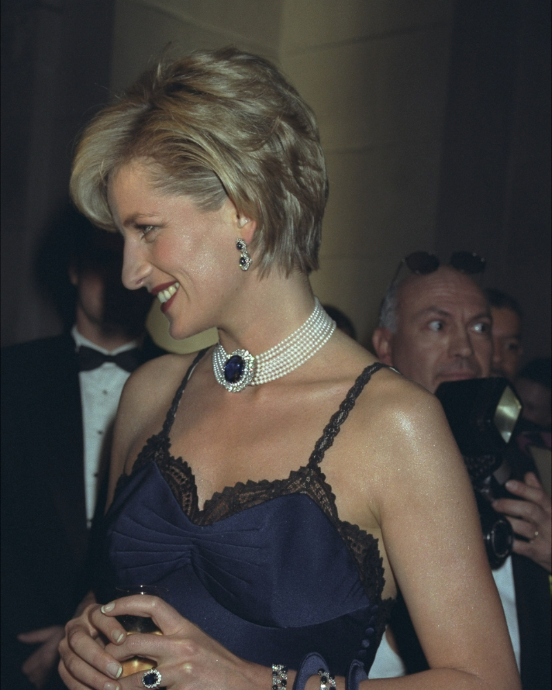 Pero el impacto no estuvo solo en el vestido. El styling fue clave para consolidar el momento. Diana combinó la pieza con un llamativo collar de zafiros y perlas, una joya que originalmente era un broche y que reinterpretó como gargantilla, sumando contraste y sofisticación a un look aparentemente simple. El resultado fue un equilibrio perfecto entre sensualidad y elegancia.