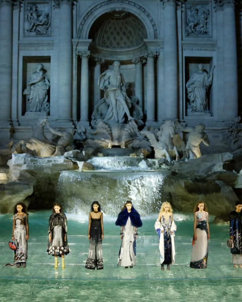 Años más tarde, en 2016, convirtió la Fontana di Trevi en Roma en un escenario majestuoso para una colección de Chanel, haciendo que las modelos caminaran sobre una plataforma transparente que daba la ilusión de flotar sobre el agua.