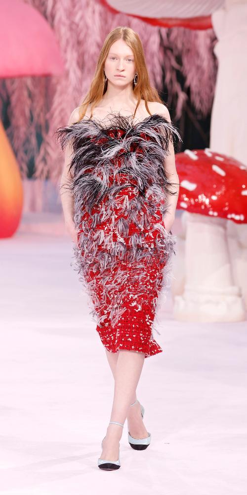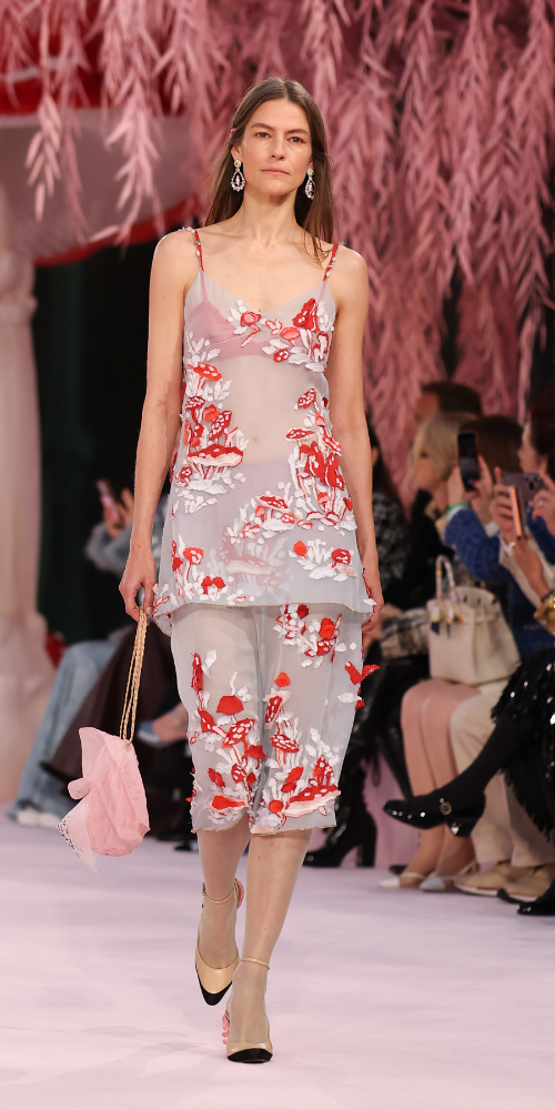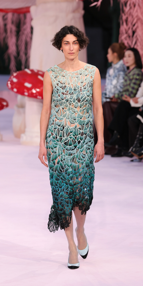 Para su estreno en la casa de la doble C, Blazy optó por una aproximación inmersiva, articulando el desfile como un viaje por mundos de fantasía. Lejos de una lectura literal de los códigos históricos de la maison, la colección propuso una exploración sensorial donde la atención se desplazó desde la silueta hacia la superficie, la materia y el gesto artesanal.