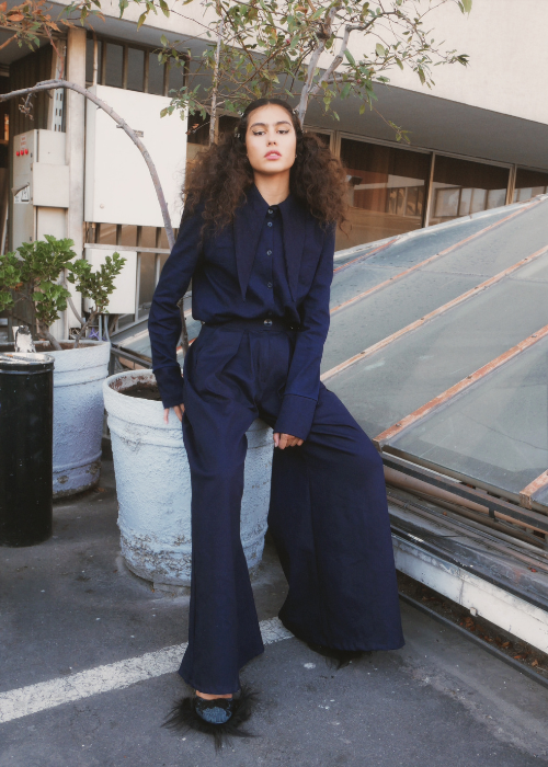 Palabras que se manifiestan en piezas de gabardina e incluso en un conjunto de denim que fue diseñado por su propia madre. Un jeans wide leg y una blusa de mezclilla; ambos en un azul oscuro sumamente sobrio que rompe con los diseños habituales de Nieves.