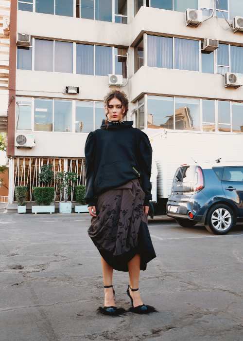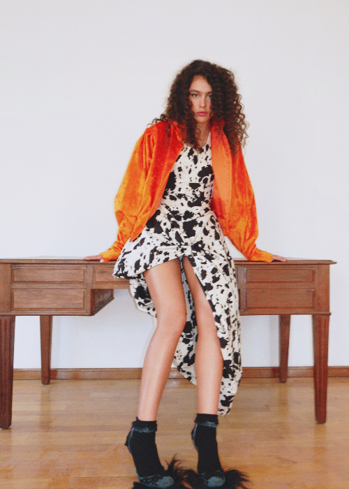 Diseño nacional que juega con la geometría, las siluetas arquitectónicas y la crudeza de los estampados punk . Volumen y asimetría que reafirma el lenguaje visual de Nieves Marín, pero desde un lugar más casero, nostálgico e incluso familiar.