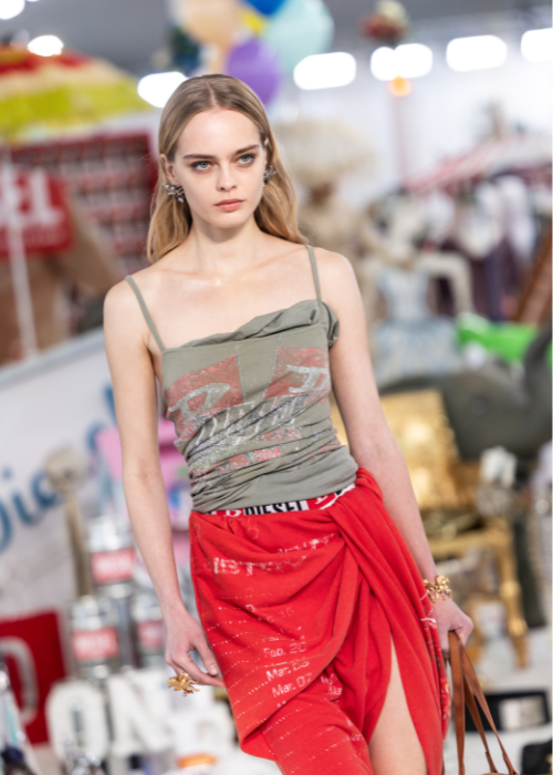 Entre el 24 de febrero y el dos de marzo se llevó a cabo una nueva versión de la Semana de la Moda de Milán. ¿El encargo de abrir el evento? Diesel. Fiel a su estilo disruptivo, la marca dirigida por Glenn Martens, presentó una pasarela con más de 50 mil piezas de archivo que sirvieron como escenario y registro de la evolución de la firma.